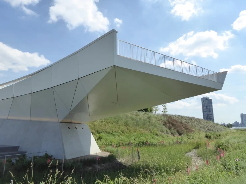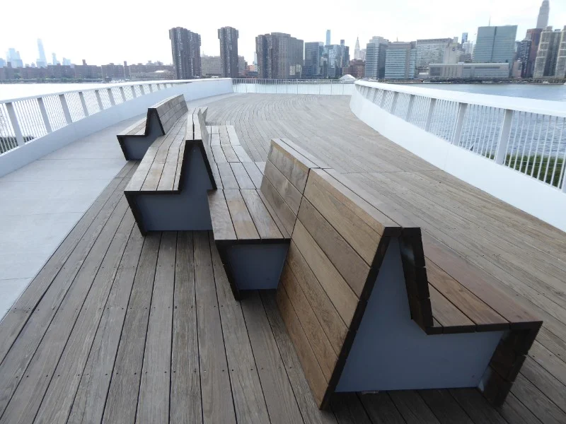 An observation deck dramatically cantilevered eight metres above the river edge provides spectacular panoramic views across the busy East River. By aligning the deck with the Empire State Building set within in the Manhattan skyline the designers have created a strong and direct visual connection between the Park and the core of New York City. The ship brow form of the observation deck makes reference to the former relationship of the site to shipping. The shape also reflects the sweeping form of the canopy structure over the outdoor waterfront eating area constructed as part of the Phase 1, which also aligns with the Empire State Building.